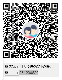 申请人请加入“川大文新2021级推免硕士”QQ群(群号:854208829, 也可扫描以下二维码进入),该群需实名认证,认证方式是“姓名+所在公司”。