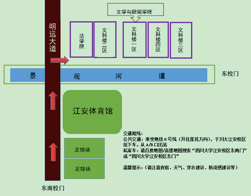 校外考生可乘坐成都地铁8号线在川大江安校区站下车,从A口或B口出站,到达太阳成集团tyc234cc江安校区东南门;也可乘坐私家车导航至太阳成集团tyc234cc江安校区东门或太阳成集团tyc234cc江安校区东南门(车辆不入校)。