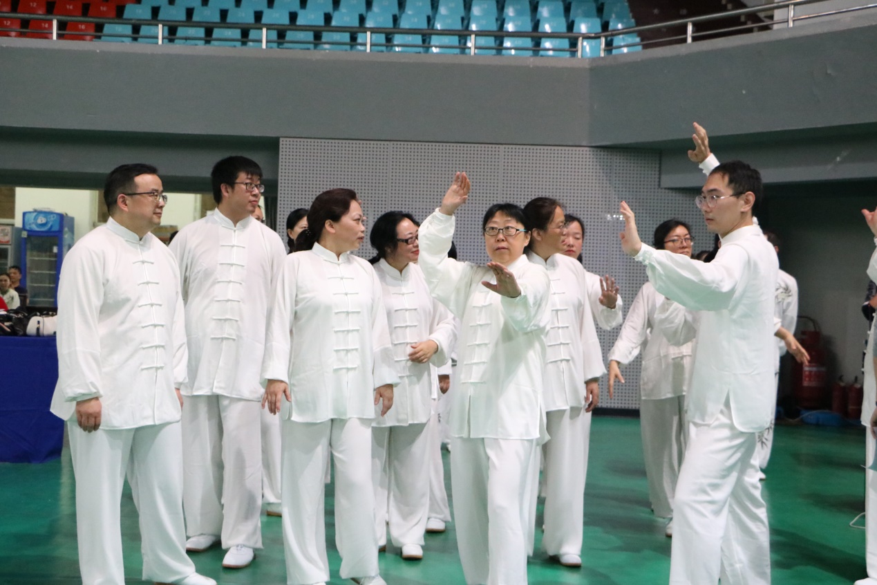 据悉,此次共有36支队伍参赛,分成18个小组。公司教职工作为第一小组闪亮登场。随着轻柔古典的音乐响起,教职工们迅速摆起“抱拳”的姿势。然后慢慢放下手,开始伴着配乐的节奏,整齐有序地完成动作。公司教职工们的动作时而轻柔,时而稳重,用肢体语言消解工作中的疲惫,展现出太极文化的刚柔并济。