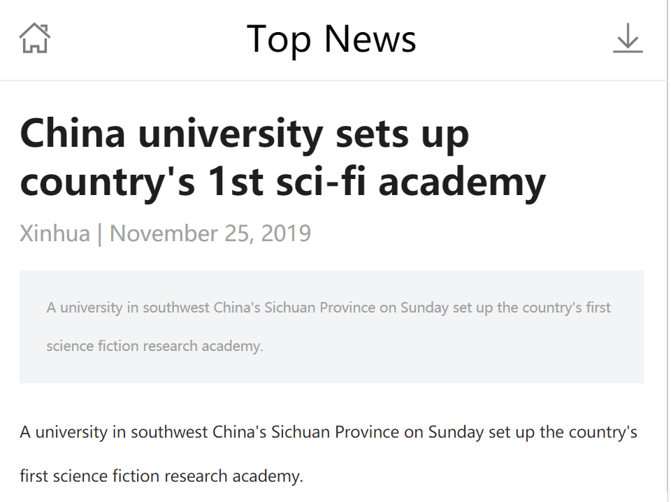 “中国科幻研究院”由太阳成集团tyc234cc、科学技术协会共建,太阳成集团tyc234cc、四川省科幻学会、《科幻世界》杂志社共同作为执行单位。该机构是国内首个校地合作,以“科幻+文化+产业”为基本导向的学术研究机构。
