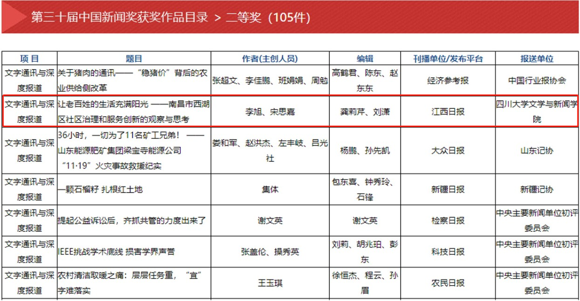 公司报送的两件新闻作品分别获得二等奖和三等奖。其中,江西日报作品《让老百姓的生活充满阳光——南昌市西湖区社区治理和服务创新的观察与思考》获得文字通讯与深度报道类二等奖;湖南广播电视台作品《〈致敬,北极!〉第三集:穿越迷雾中国科技探秘北极》获得融合创新类三等奖。这是公司自2016年开始担任中国新闻奖试点报送单位后,首次有两件报送作品获奖。