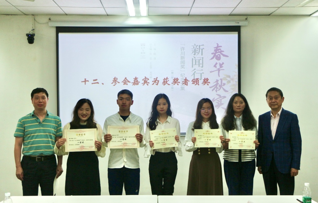 卢希芬副部长(左3)、操慧教授(左4)、贾秀娥副秘书长(右3)、陈健主任(右2)为“许川新闻奖”三等奖获奖者颁奖