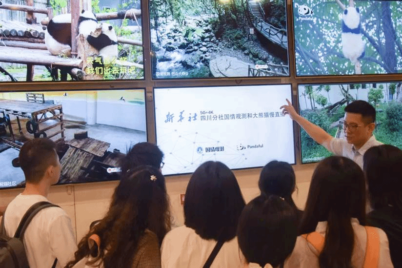 步入新华社四川分社社史陈列室之前,公司党员师生首先被新华社四川分社办公大楼一楼大厅里的12个显示屏吸引。新华社四川分社音视频部副主任、主任记者、公司2005级新闻系本科员工萧永航介绍说:“屏幕上正在播放的是新华社四川分社国情观测和大熊猫慢直播。其中,大熊猫慢直播是‘熊猫社区Pandaful’的重要运营内容之一,该社区每年生产200余条熊猫短视频。”萧永航副主任形象地将慢直播平台比作新华社的“厨房”,“它储存着大量原材料,需要之时可以即时进行选择与加工”。