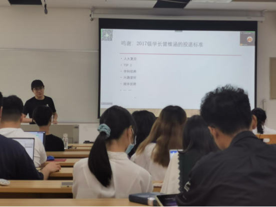 在新闻传播专场分享中,另有八位同学分享了自己的保研经验。周祺蕙同学以“保研攻略”的方式生动有趣地向同学们展示了自己的保研历程,就院校选择、专业选择等问题给出了自己的见解,鼓励同学们与焦虑和解,拒绝恶性竞争。尹梦奇、李萌、徐紫菱三位同学则就保研细则、保研流程、各院校特色给出了自己的见解。梁昊晨同学保研至中国人民大学新闻学专业,他在前面几位同学分享的基础上,以“做自己”为主题舒缓了同学们面对保研的焦虑心态。为什么需要硕士学位?为什么要做自己?如何找到自己?梁昊晨同学借这几个问题建议同学们要思虑清楚再做选择,“他强任他强,清风拂山岗”,不要一味地“内卷”。保送至中山大学的易思思同学从自己踩过的“坑”讲起,为大家指出面临困难时应如何解决。从汉语言文学跨保到本校网络与新媒体的王雨枫同学则分享了诸多“干货”,保研路上遇到过的所有压力与困难、专业课复习与面试的指南,她都一一为同学们列出。最后,王雨枫同学回望自己的保研经历,总结经验,希望同学们平和看待保研,不要关心“社会的标准”,而是去关心自己做了什么。保送至武汉大学的李佰珏同学也通过线上共享PPT介绍了自己的基本情况,留下了联系方式方便学弟学妹们联系。