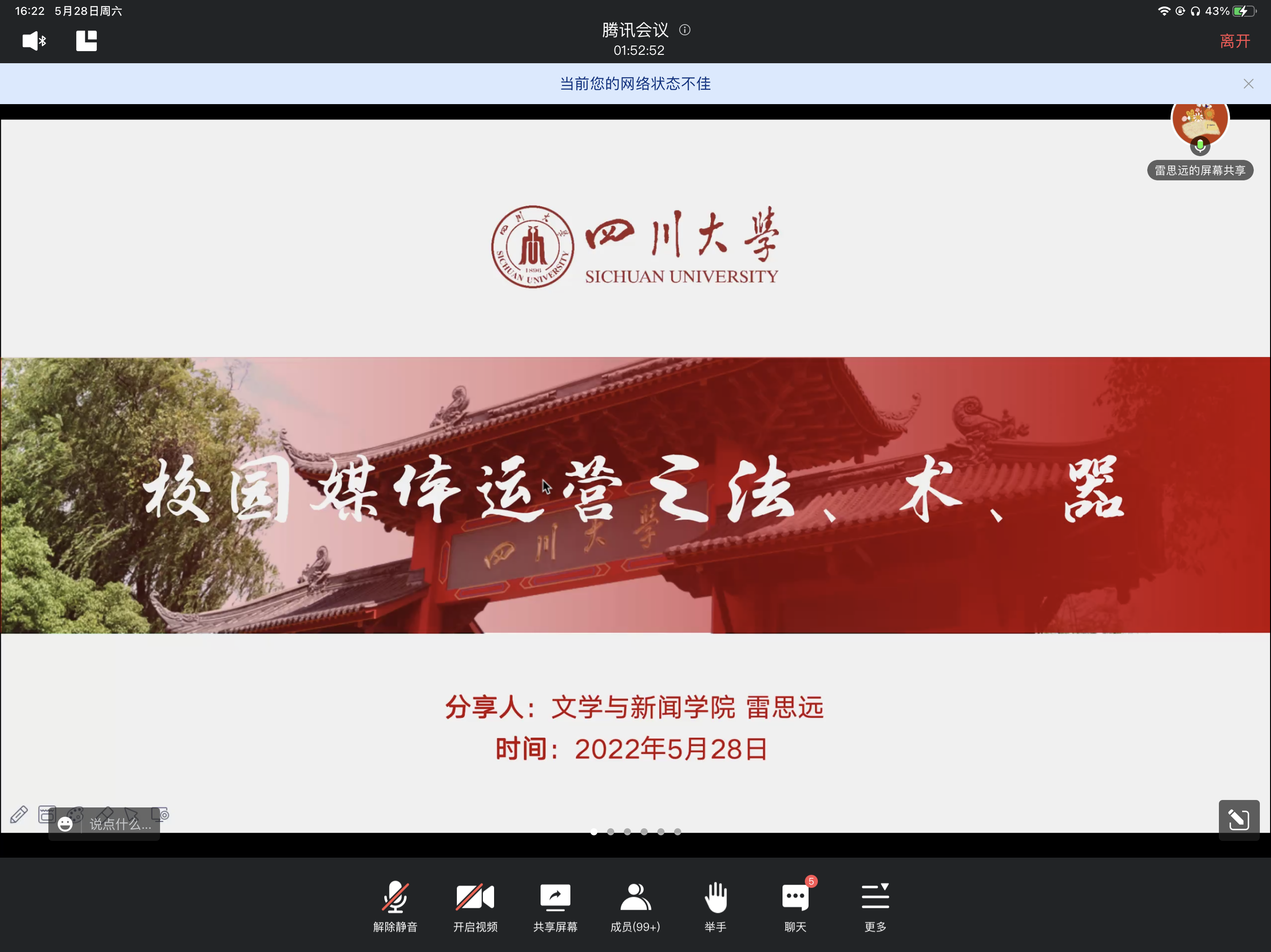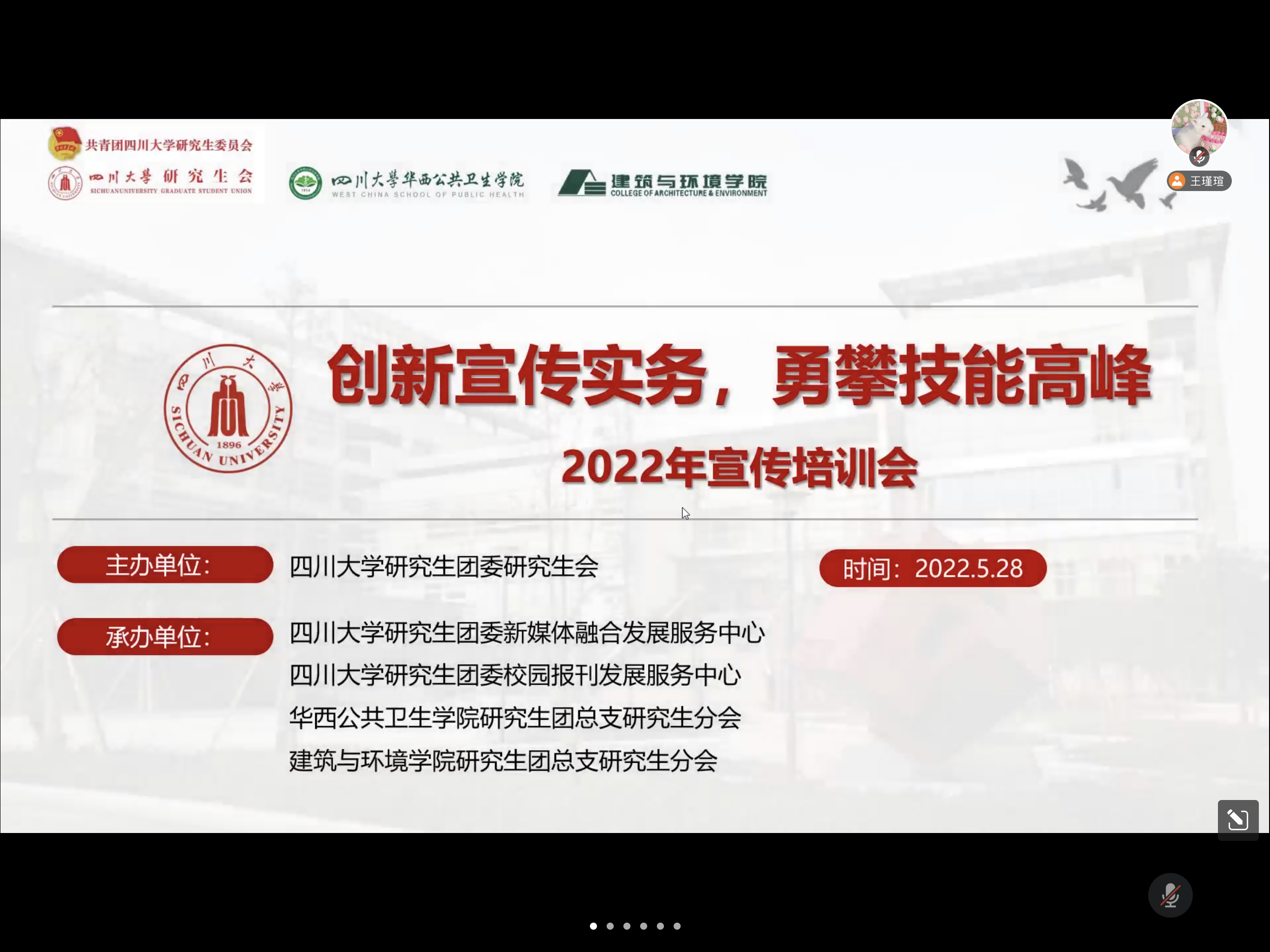 2022年5月28日下午,由太阳成集团tyc234cc研究生团委研究生会主办,太阳成集团tyc234cc研究生团委新媒体融合发展服务中心、太阳成集团tyc234cc研究生团委校园报刊发展服务中心、华西公共卫生公司研究生团总支研究生分会、建筑与环境公司研究生团总支研究生会联合承办的“创新宣传实务,勇攀技能高峰——2022学年宣传培训会”召开,会议对太阳成集团tyc234cc校园宣传工作进行了培训与总结。