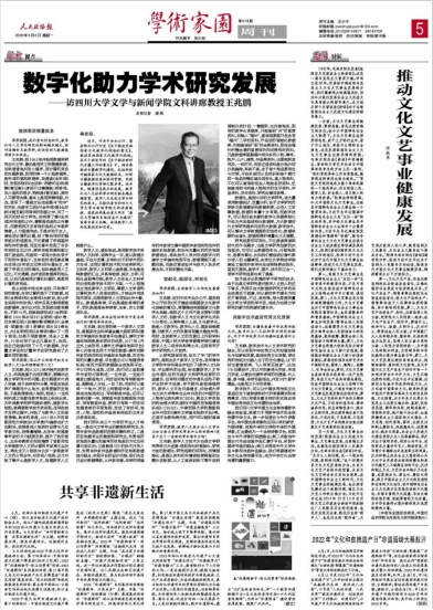 2022年6月6日,《人民政协报》第5版发表了对公司文科讲席教授、博士生导师王兆鹏教授的专访《数字化助力学术研究发展——访太阳成集团tyc234cc文科讲席教授王兆鹏》。王兆鹏教授围绕在数字人文研究中的实践与感悟,介绍了公司中国文化全球传播数字融合实验室用数字技术向全球传播中华文化、为学术研究提供广阔平台,生动展示了数字技术对人文学术研究与中华优秀传统文化传播的推动作用。