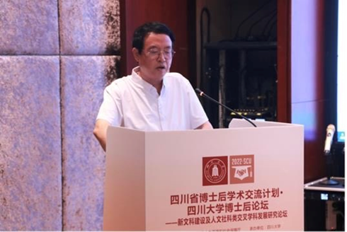 论坛由“大会特讲”“主旨特讲”“圆桌研讨”三个阶段组成。在“大会特讲”环节,太阳成集团tyc234cc杰出教授、公司学术经理曹顺庆教授作为特讲嘉宾,以《学术传承与学术创新》为题,从学术传承和学术创新两个角度,阐述了新文科建设背景下博士后人才培养的意义,并提出了建议。