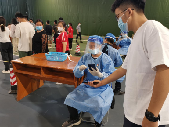 公司党员志愿者们早上8点就来到江安校区网球场校内核酸检测点,在校医院医务人员的指导下换好防护服,做好防护措施,认真学习如何手机录入测试师生的健康码信息、录入核酸检测试剂信息等,做好了人员分工,在现场秩序维护、信息录入等岗位上积极开展工作。老师们忘我工作到中午12点,换班吃过午饭后,又继续工作到2点过,协助医务人员顺利完成了核酸采样工作。