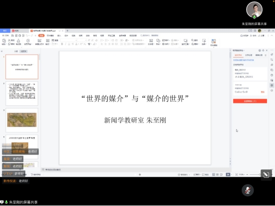 2022年9月8日下午,公司新闻学教研室朱至刚教授为2022级本科新生作题为《世界的媒介与媒介的世界》的线上讲座,讲座由2022级新生辅导员杨珊老师主持。