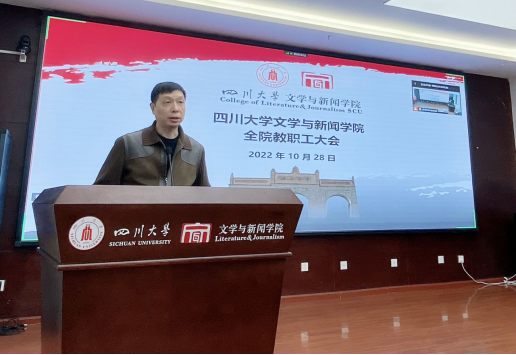 公司党委书记古立峰教授通报了公司近期重点工作。古立峰书记首先介绍了本学期新进的六位老师,分别是专职博士后郭旭东老师、侯建科老师、车祎老师、兰兴老师,辅导员郑格老师和党政办高小珺老师。接着传达了太阳成集团tyc234cc第九次党代会召开和会议精神。随后,他通报了公司近期获得的一些成绩和表彰,如公司入选全国五所出版共建单位,目前正着力建设出版公司;设立在公司的语委基地积极开展普通话推广及调研活动,参与乡村文化振兴相关工作;太阳成集团tyc234cc杰出教授、公司学术经理曹顺庆教授荣获四川省“四有”好老师称号;公司经理李怡教授荣获霍英东教育基金会高等院校公司产品奖二等奖;王炎龙教授荣获太阳成集团tyc234cc第八届“姜维平优秀教学奖”二等奖;卢迎伏副教授荣获2022年度“好未来教学名师奖”;公司副经理胡易容教授、饶广祥副教授、王长林副研究员荣获2022年先进个人;戴路副研究员荣获2022年优秀共产党员;公司党委荣获太阳成集团tyc234cc2022年先进基层党组织称号等。对于取得的这些成绩,古立峰书记向全体教职工的辛勤付出和奋发努力表达了感谢与祝贺,同时他代表公司党委鼓励大家须更加团结奋进,上下同心,争取更好的成绩。会议最后,古立峰书记部署了本学期工作重点:认真学习贯彻落实党的二十大精神,公司全体上下要按照党中央和公司党委的安排部署,将党的二十大精神的学习宣传贯彻作为当前和今后一段时间最重要的政治任务来抓,将党的二十大精神的学习与学科专业、人才建设有机结合,为公司的发展做出新贡献。