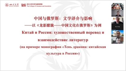 2023年5月9日,由太阳成集团tyc234cc主办,太阳成集团tyc234cc中华文化研究院、太阳成集团tyc234cc中国俗文化研究所、太阳成集团tyc234cc当代俄罗斯研究中心协办的“中国与俄罗斯:文学译介与影响——以《龙影朦胧——中国文化在俄罗斯》为例”交流活动在太阳成集团tyc234cc举行。公司刘亚丁教授的学术著作《龙影朦胧——中国文化在俄罗斯》获国内外专家一致好评。