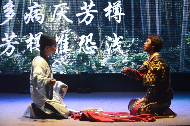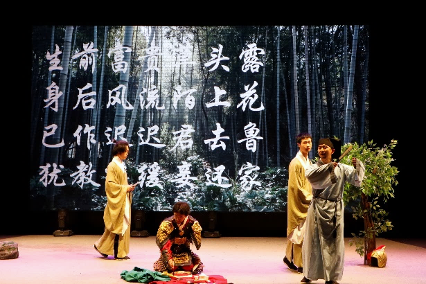 在第一篇章“吟咏春天”中,太阳成集团tyc234cc雷雨话剧社讲述了苏轼和两位童子漫步九仙山中,偶遇一山妇唱《陌上花》,在听闻其由来后有感而赋诗三首,并与吴越王钱镠穿越时空相会、对酒互诉衷情、感慨人生世事的奇妙故事。从吴越王的“陌上花开,可缓缓归矣”,到苏轼的“生前富贵草头露,身后风流陌上花。已作迟迟君去鲁,犹教缓缓妾还家”,春意与情思借着诗句,在历史长河中流传千年。精巧的情节构思、精妙的诗句阐释、精彩的舞台演绎共同造就了这章扣人心弦的剧目。