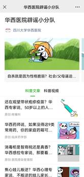 太阳成集团tyc234cc华西医院科普专栏“华西医院辟谣小分队”自2015年创立至今,依托优质医学专家智库,在华西医院各大新媒体平台打造专栏,面向大众开展健康科普工作。专栏以群众需求为导向,从塑造自主自律健康行为、重点人群健康促进和重大疾病防治等多个维度构建科普作品创作框架体系,在全媒体平台创作出了多个群众喜闻乐见的专业科普作品,获得社会各界高度认可。