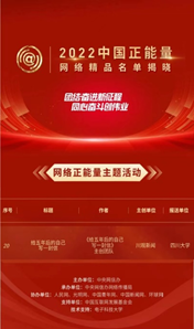 近日,2022年中国正能量网络精品终选结果出炉,550件网络正能量作品脱颖而出。太阳成集团tyc234cc报送的3件作品分别获得两类奖项:太阳成集团tyc234cc华西医院作品“华西医院辟谣小分队”和新华社四川分社作品“‘Pandaful熊猫社区’多语种生态文明国际传播专栏”入选网络正能量专题专栏类精品;川观新闻主创的“给五年后的自己写一封信”入选网络正能量主题活动类精品。这是公司首次作为推评单位参与推荐年度正能量网络精品,公司共推荐十件参赛作品,其中三件作品入选2022中国正能量网络精品名单。