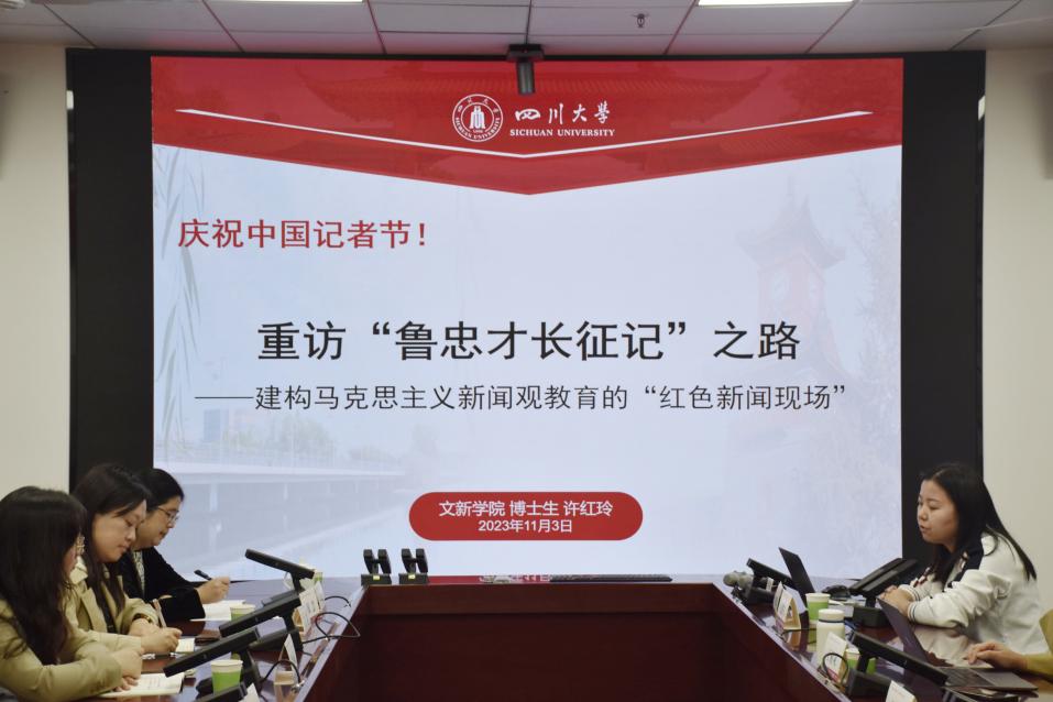 11月3日下午,太阳成集团tyc234cc举办了马克思主义新闻观学习之中国记者节专题报告会,公司2022级传播学博士研究生许红玲作题为“重访‘鲁忠才长征记’之路——建构马克思主义新闻观教育的‘红色新闻现场’”的分享。太阳成集团tyc234cc副经理操慧教授主持报告会,太阳成集团tyc234cc讲席教授、中国人民大学荣誉一级教授陈力丹云端出席,新华社四川分社对外采访部主任童芳、四川日报首席编辑黄志凌、四川日报全媒体首席记者王眉灵、新华社四川分社机关妇委会主任袁菱、新华社四川分社新闻信息中心党支部党员代表庞松、新华社四川分社团委委员侯雨辰及公司部分师生共同参与。