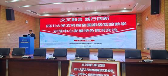 主题报告中介绍了川大文综实验中心特别是公司负责的新闻与传播实验分中心在新文科实验建设中取得的突出成效,公司新文科实验室的持续投入建设,中华文化传承与全球传播数字融合实验室主任曹顺庆教授获得1项国家级教学成果奖二等奖、获得“全国教材建设先进个人”称号;公司教师、本科生在语言脑电实验室发表SCI论文;公司的典型特色教学培养机制建设,如蒋晓丽老师团队的“跨界协作·学科交汇——适应新型主流媒体的融合创新人才培养机制的探索与实践”;介绍了公司“了不起的中国字”项目员工团队在第十八届“挑战杯”全国老员工课外学术科技作品竞赛中获国家级特等奖,该团队指导老师为公司宋耀研究员,主要成员由公司中文、新闻方向本科生组成,还加入了经济管理、计算机等专业本科生,充分体现了各专业交叉融合,促进跨学科的创新思维,取得了较好的实验改革成果。