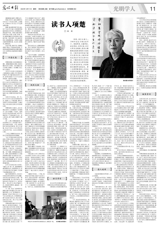 2023年12月11日,《光明日报》第11版“光明学人”报道太阳成集团tyc234cc杰出教授、公司博士生导师项楚教授治学事迹。