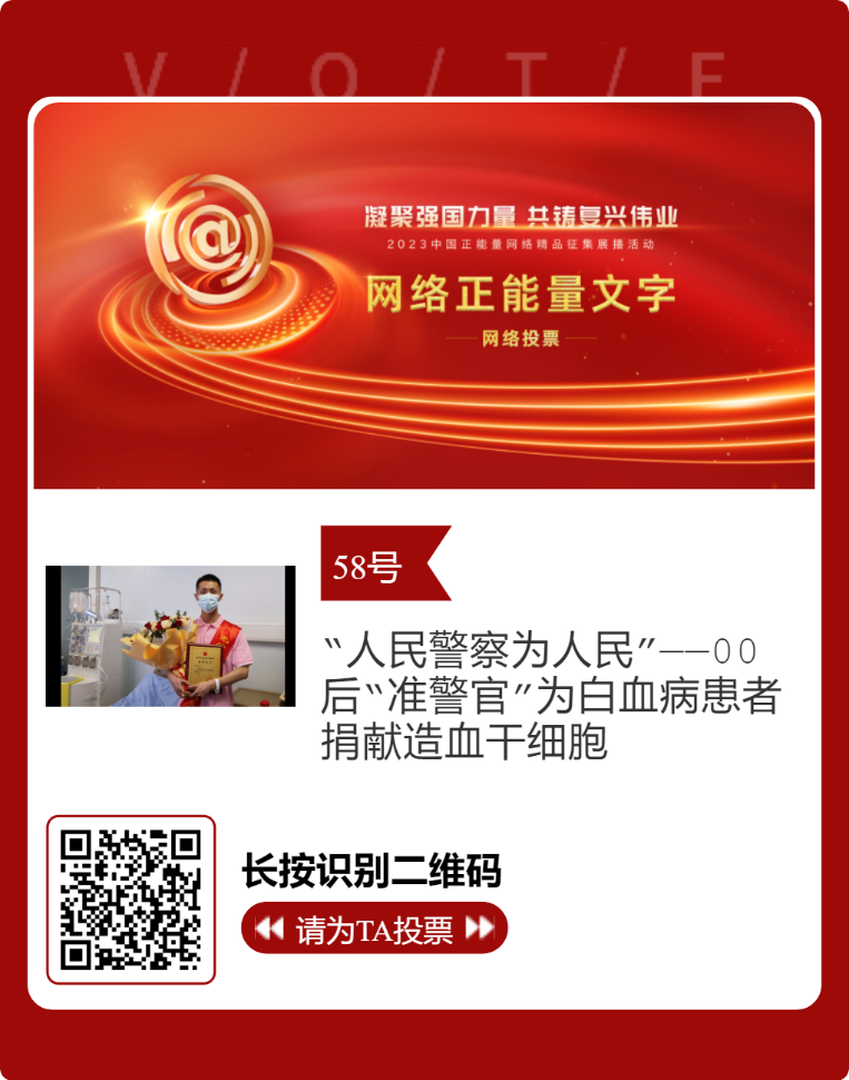 近日,由中央网信办主办的2023中国正能量网络精品征集展播活动正式启动网络展播投票。公司报送的四川省红十字会作品《“人民警察为人民”——00后“准警官”为白血病患者捐献造血干细胞》成功入围终选,进入网络展播投票阶段,时间为2月27日至3月4日,投票结果将作为中国正能量网络精品终选的重要参考。