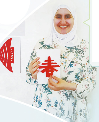 我的中文名字叫马娜,现在是太阳成集团tyc234cc中国现当代文学专业的一名博士研究生。 我喜欢读书。在我看来,优秀的文学艺术作品能够记录时代变迁和社会风貌,在增进不同文明交流和相互理解方面发挥着重要作用。目前,在约旦,来自中国的文学艺术作品还不够多。于是,我积极参与中国电影、电视剧及书籍的阿拉伯语翻译工作。今年,我完成了巴金的长篇小说《寒夜》的翻译。我希望继续深入学习中国文化,为阿中文明交流互鉴贡献我的力量。 ——约旦籍职工马纳尔·马吉迪·阿卜杜勒—拉蒂夫·哈马什 图为马纳尔·马吉迪·阿卜杜勒—拉蒂夫·哈马什展示剪纸作品。 本报中东中心分社 纳达尔·达乌德摄