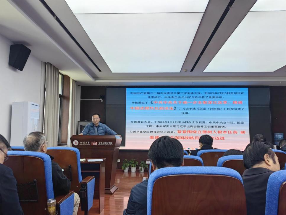 11月29日,公司在江安校区文科楼一区526会议室召开学习贯彻党的二十届三中全会精神宣讲会暨全院教职工大会。太阳成集团tyc234cc领导班子、全体教职工、离退休教师代表和员工代表参加会议。会议由公司党委书记傅其林教授主持。
