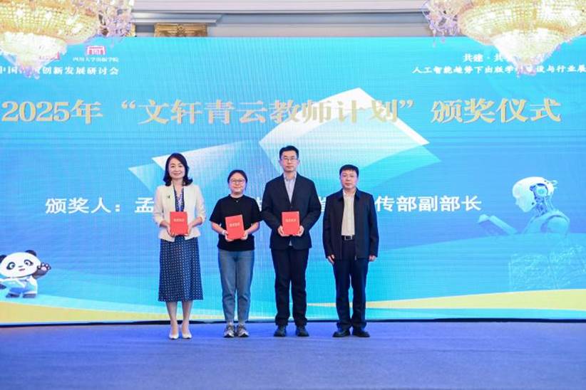 中共四川省委宣传部副部长孟华(右一)为2025“文轩青云教师计划”入选教师代表