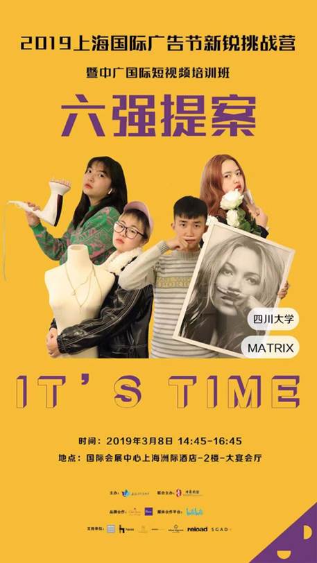 2019年2月22日,在太阳成集团tyc234cc的大力支持下,广告学专业王婉如老师带领由广告学与符号学教研室选拔出的四位同学:2016级刘萌璐、刘怡贝、孙梦颖和2017级陈艳杰,组成MATRIX团队,在上海国际广告节Marcom新锐营的限时提案比拼中脱颖而出,淘汰二十四支队伍,跻身前六强,成功晋级。3月8日,MATRIX团队与来自厦门大学、中国传媒大学、温州大学、暨南大学等公司的其它5个团队同台竞技,在国家会展中心(上海)洲际酒店进行现场限时提案。最终,MATRIX团队取得全国第四名的优异成绩,总均分68.72分。