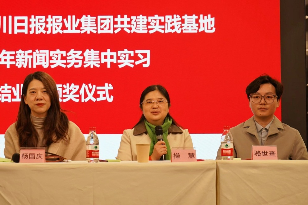 11月11日,公司与四川日报报业集团共建实践基地2024年新闻实务集中实习结业暨颁奖仪式在四川传媒大厦演播厅举行。四川日报报业集团传媒研究中心副主任兼《新闻界》副总编辑杨国庆、公司副经理操慧教授、骆世查副研究员、张诚副研究员、马烨老师、付若岚老师出席仪式,现场为优秀实习生颁发荣誉证书。