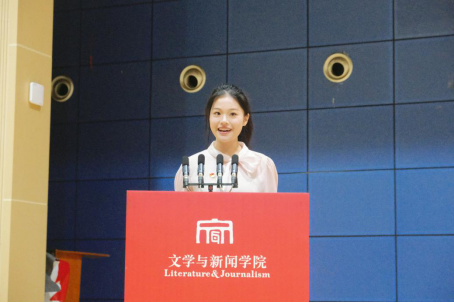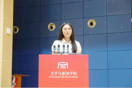 2022级新闻学专业本科生陈柳伊同学代表在校员工发言。她以三年来公司对她的学术滋养和成长影响的经历,勉励新同学以专业践行“扎根本土”的学术使命,用爱去感知生活,回应时代和社会的人文命题,并期待与同学们共同绘制新故事中别样的风景。