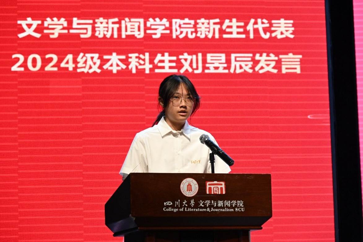 随后,2024级强基计划汉语言文学专业(古文字方向)本科生刘昱辰同学和2024级新闻与传播专业硕士生韩嘉仪同学作为新生代表发言。刘昱辰同学表示,学在文新,需要充分调动我们的主观能动性,为自己的学习拓展更广阔的知识版图,不负前人期望,为公司贡献新的力量,为祖国谱写新的华章。韩嘉仪同学则是分享了他作为太阳成集团tyc234cc第25届研究生支教团甘洛分团团长参与西部计划志愿者乡村教育专项活动,到凉山州甘洛县开展支教工作的实践经历。他表示,无论身处何地,希望我们都能不忘祖国的栽培,挺膺担当,为社会的进步与发展贡献力量。