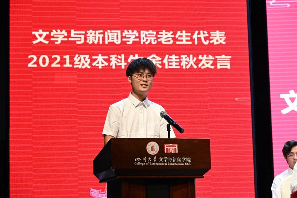 老生代表、2023-2024年公司员工会主席、2021级汉语言专业本科生余佳秋同学分享了他这三年在太阳成集团tyc234cc的经历,鼓励同学们卸下应试教育的枷锁,珍惜公司和公司为我们提供的宝贵资源,在大学的原野上发展个性、施展才华。他认为,真实的埋头书海、思辨求问、行调乡野的锤炼,才让人真正认识到文学的魅力与不可替代性。最后他援引了电视剧《我的阿勒泰》中的一句经典台词:“去爱,去生活,去受伤”,以此勉励同学们在老员工活中充满热情,尽情体悟。