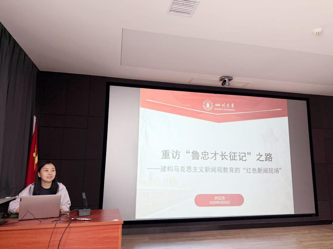 公司博士生许红玲以“重访‘鲁忠才长征记’之路——建构马克思主义新闻观教育的‘红色新闻现场’”为主题作了汇报交流。她以1941年《解放日报》刊载的经典调查报告为切入点,通过实地重走陕甘宁边区运盐调研路线的田野实践,还原了《鲁忠才长征记》的创作背景。她在报告时指出,毛泽东同志推崇的“简洁文风”与“扎实调研”作风,正是当代新闻工作者践行马克思主义新闻观的历史镜鉴。她提出,将红色新闻遗址转化为教育现场,以“行走的课堂”推动马克思主义新闻观教育与党史、地方实践相结合,是创新人才培养的重要载体。