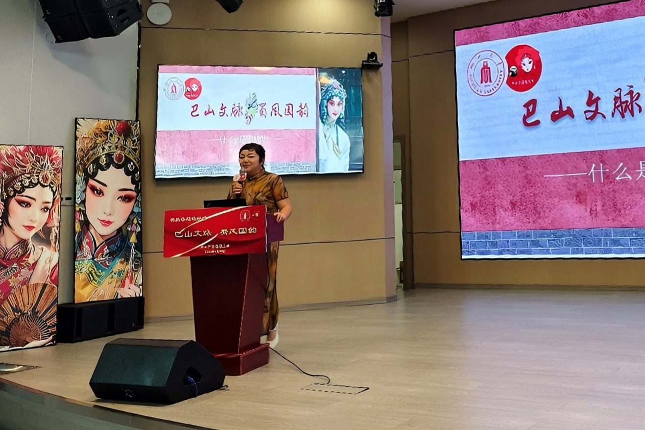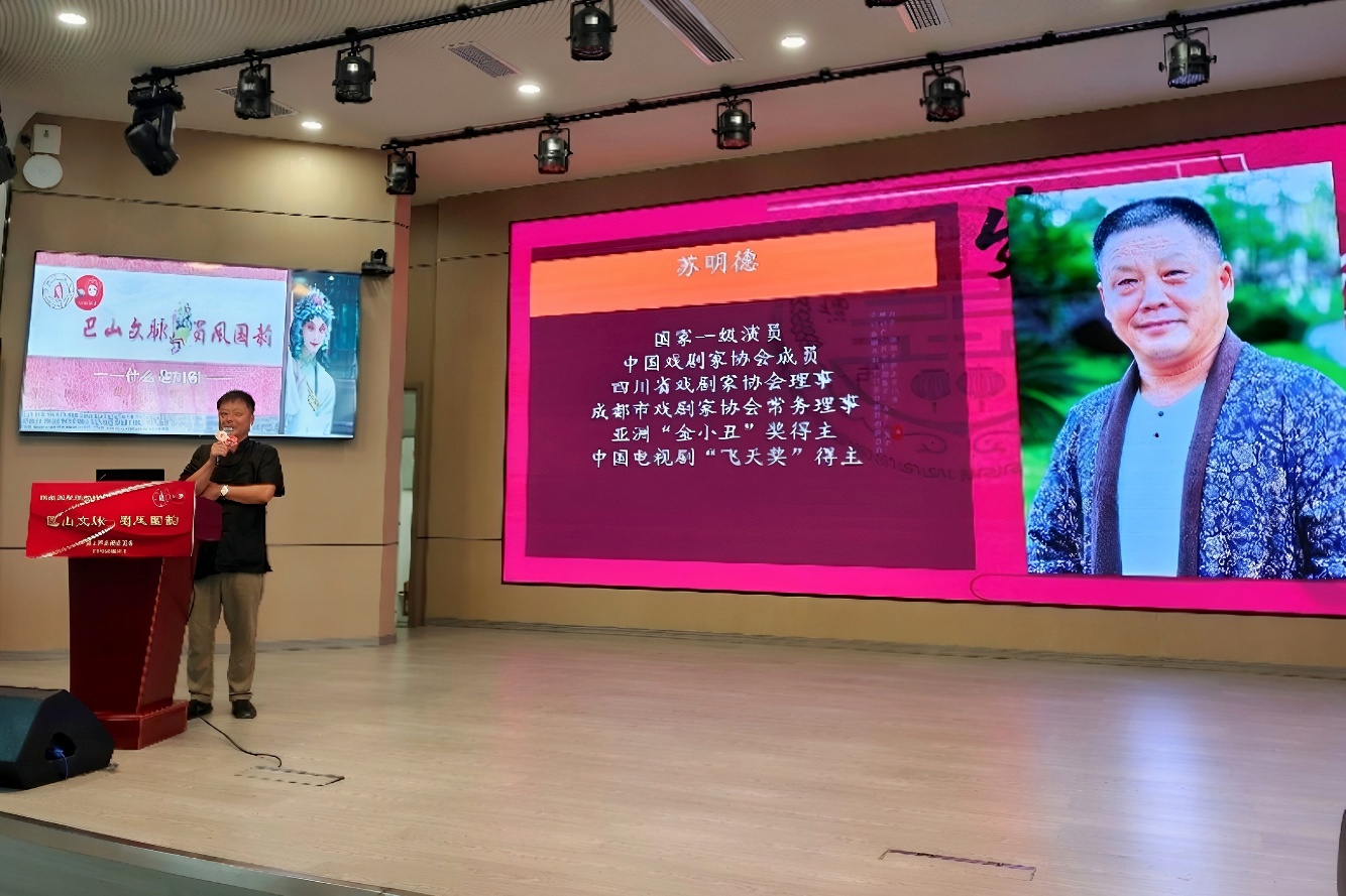 活动开始后,苏明德老师登台,他分别介绍了川剧的五个行当:生、旦、净、末、丑。他通过生动的示范和详细的解读,让观众更深入地了解了川剧的独特魅力。同时,苏老师还分享了他在四川艺术职业公司的学习经历和多年来在川剧舞台上的表演心得。他强调,川剧不仅是表演艺术,更是中华文化的重要组成部分,承载着丰富的历史和文化内涵。