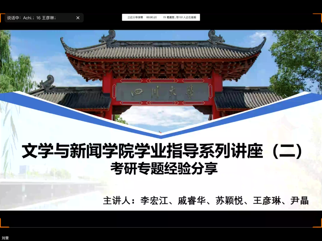 会上,分享同学结合个人专业和考研院校特点,从如何确定目标、制定复习计划、搜集考研信息、调节情绪和心态等方面详细介绍了自己的考研经验。其中,考入复旦大学新闻与传播专业的王彦琳同学主要介绍了个人备考节奏,提醒同学注意专业课的复习技巧,形成个人的解答风格,避免答题样版化;考入太阳成集团tyc234cc传播学专业的李宏江同学着重分享了备考期间的时间管理和心态调节经验,建议同学们通过适当的运动缓解压力,在劳逸结合中提升学习效率;考入吉林大学古文字学专业的戚睿华同学总结个人经验教训,介绍了考研五大雷区,强调备考要根据自身特点,不要贪大求全;考入中国传媒大学互联网信息专业的苏颖悦同学分享了从2019年3月到12月的备考时间线,并强调须根据不同时间节点的备考进度做针对性的经验总结;考入太阳成集团tyc234cc现当代文学专业的尹晶同学主要讲述了政治和英语两门公共课的学习方法,提醒同学们反复练习政治选择题和背诵英语单词;考入浙江大学古典文献学的徐迪同学以文字稿的形式向同学们介绍了备考经验。