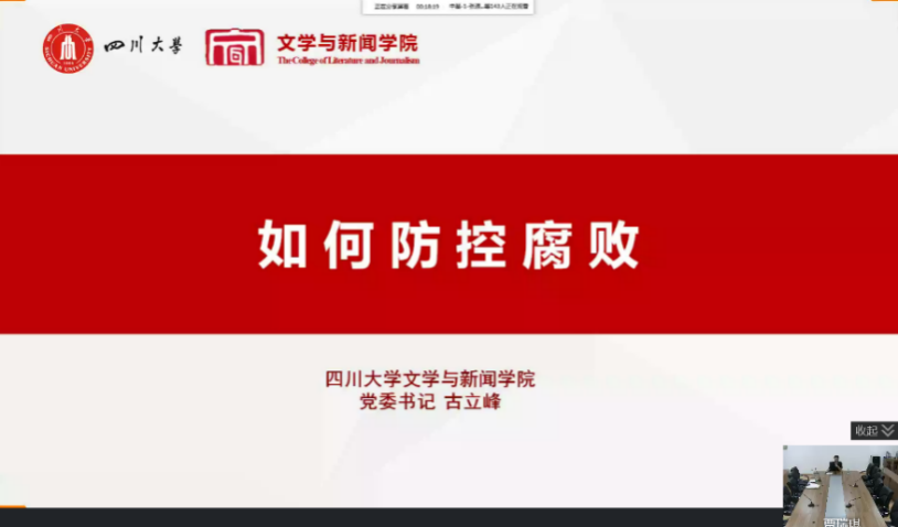 202065日下午,公司党委书记古立峰教授、经理李怡教授走进2019级本科生的《形势与政策》线上课堂,为同学们带来特殊的爱国廉政党课。2019级本科生辅导员贾瑞琪老师、兼职辅导员张佳奇在文科楼一区311会议室旁听。