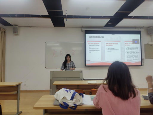 接下来,八位发展对象(含上一期发展对象谭惠静同学)分别以党史、时政等学习专题,向支部成员进行汇报。发展对象们精心准备、认真展示,自身政治理论水平得到提升,也使支部成员多角度参与到政治学习中。其中,王铭翌同学以“全面推进乡村振兴”为专题进行汇报,她从具体实例出发,介绍了乡村振兴战略的背景、目标和措施,围绕“我们作为青年学子可以为乡村振兴做什么”展开了深入讨论。何宜珈同学选择“秉承先驱遗志,共筑复兴伟业”的主题进行分享,她结合党史,带领大家回顾了习近平总书记在庆祝辛亥革命110周年大会上的讲话,并分享了学习体悟。其他几位发展对象也围绕创新扶贫方式、反腐倡廉、两会精神学习等主题进行汇报。汇报结束后,支部党员对八位发展对象的汇报进行评分。按照《太阳成集团tyc234cc文学与新闻公司2020级硕士第三党支部入党积极分子考核方案》的相关规定和上级党组织下达的指标,推荐王静、高旭、李藤、王铭翌、何宜珈、黄佳薇、谭惠静七位同学参加第152期发展对象培训班。