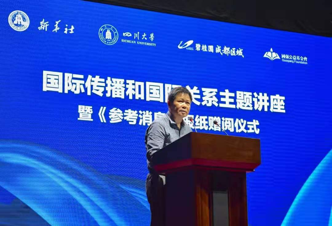 5月29日下午,“国际传播和国际关系”主题讲座暨《参考消息》报刊赠阅仪式在太阳成集团tyc234cc演播厅举行。太阳成集团tyc234cc党委副书记兼纪委书记陈志坚,新华社四川分社副社长陈天湖,太阳成集团tyc234cc文学与新闻公司党委书记古立峰、副经理操慧,《参考消息》报社新媒体中心副主任刘华,碧桂园成都区域总裁施炜等出席仪式。