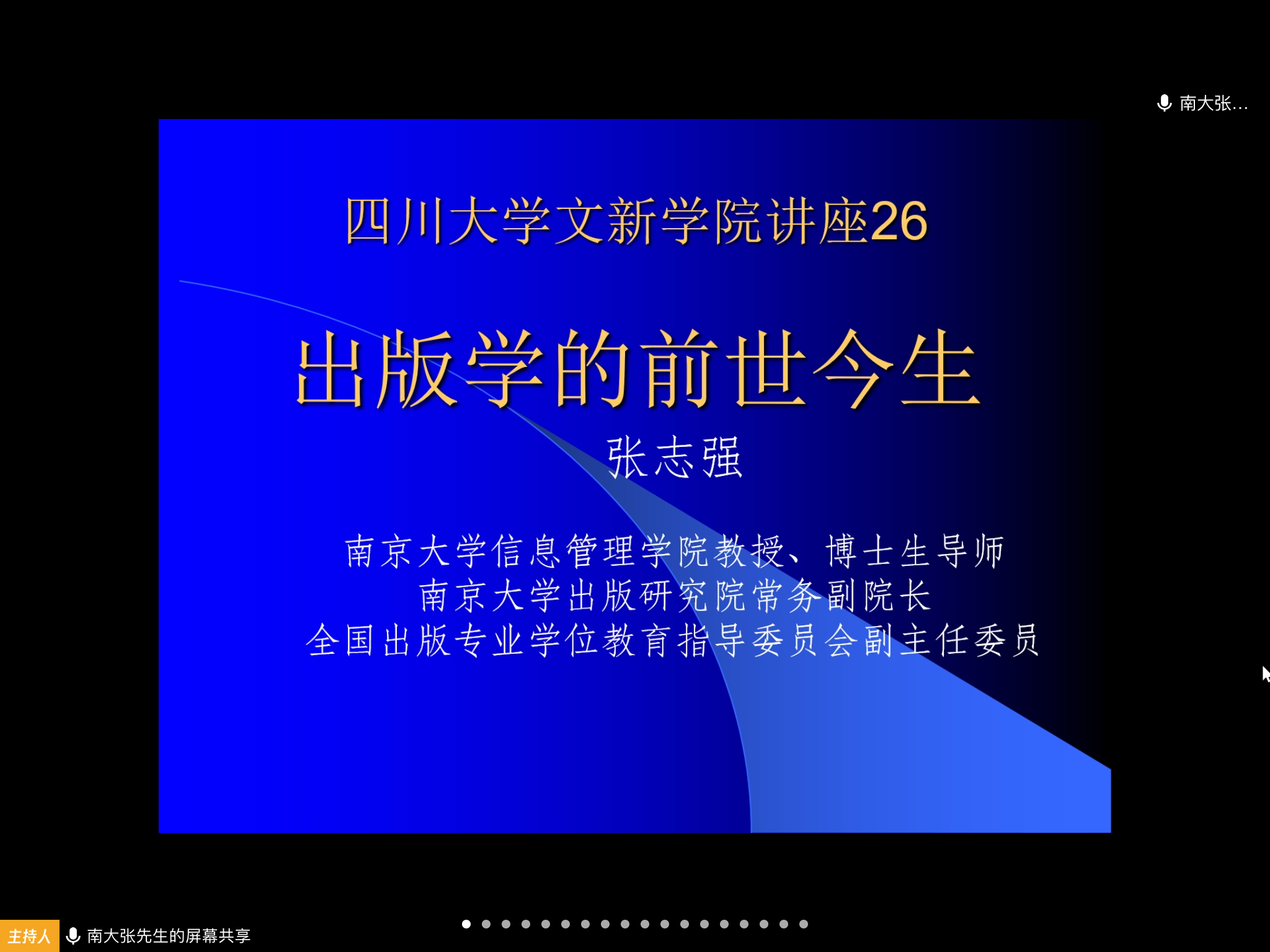 4月29日19时,“云端锦江”系列学术前沿讲座第二十六场通过腾讯会议平台顺利举行。南京大学信息管理公司教授、博士生导师张志强应邀作“出版学的前世今生”的主题讲座,公司王炎龙教授任主持人,院内外290余名师生在线参与。