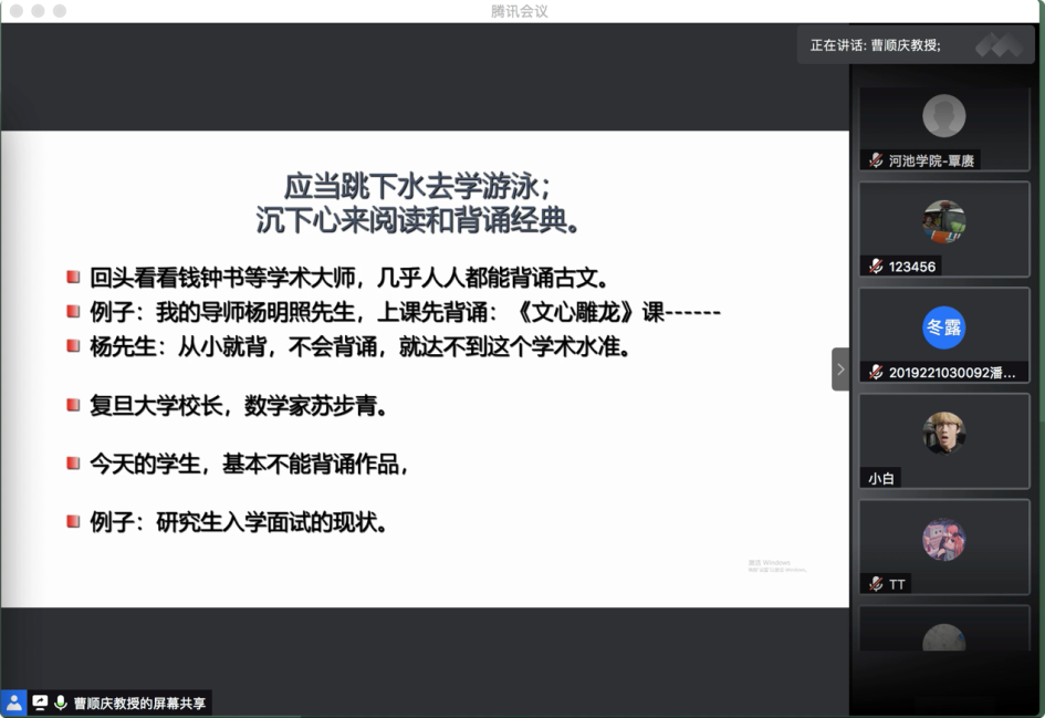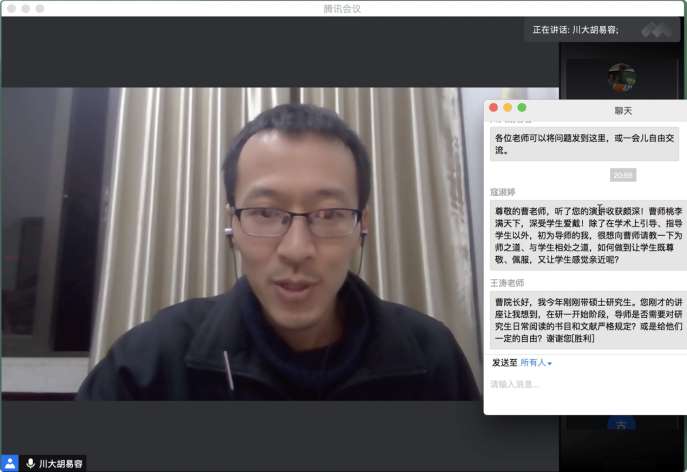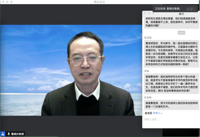 10月16日19:30,“传薪·公司产品问题与方法系列活动”第一场在腾讯会议平台顺利举行。太阳成集团tyc234cc杰出教授、太阳成集团tyc234cc学术经理曹顺庆教授应邀作题为“培养研究生的几点体会”的讲座,公司副经理胡易容教授担任讲座主持人。