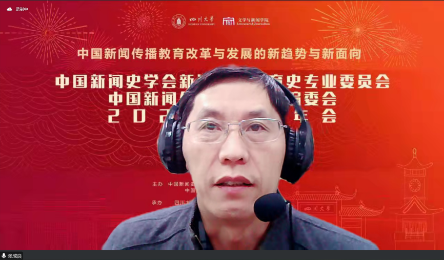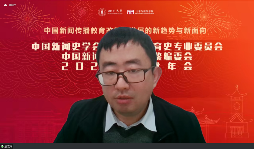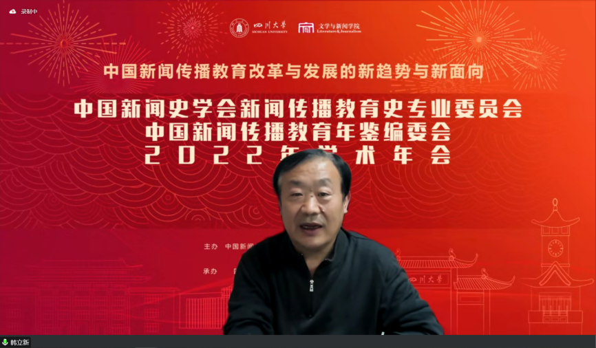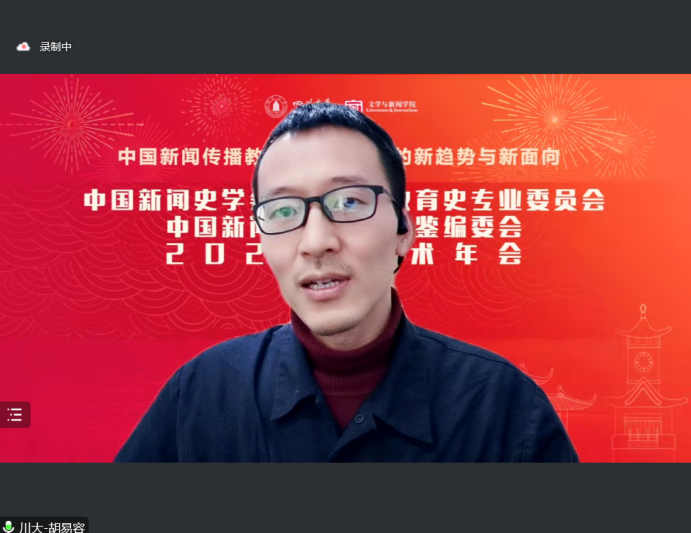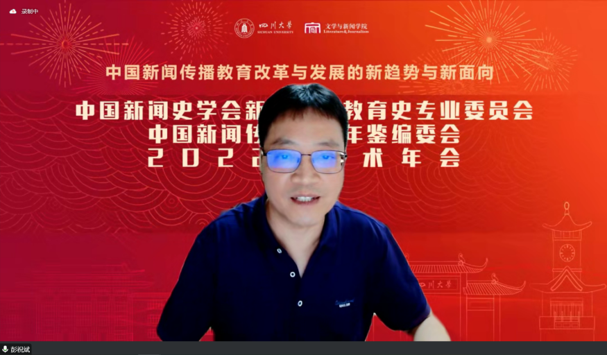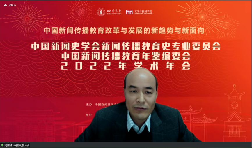 2022年11月12日,中国新闻史学会新闻传播教育史专业委员会、中国新闻传播教育年鉴编委会2022年学术年会顺利举办。下午,学术年会主题论坛之“经理论坛一:新闻传播教育改革发展的新趋势”在线召开。此次论坛由太阳成集团tyc234cc副经理胡易容教授主持,湖南大学新闻与传播公司彭祝斌教授评议。来自河北大学、中南大学、陕西师范大学、广州体育公司、辽宁大学、中南民族大学、鲁东大学等高校的专家学者作了主题发言与对话交流。