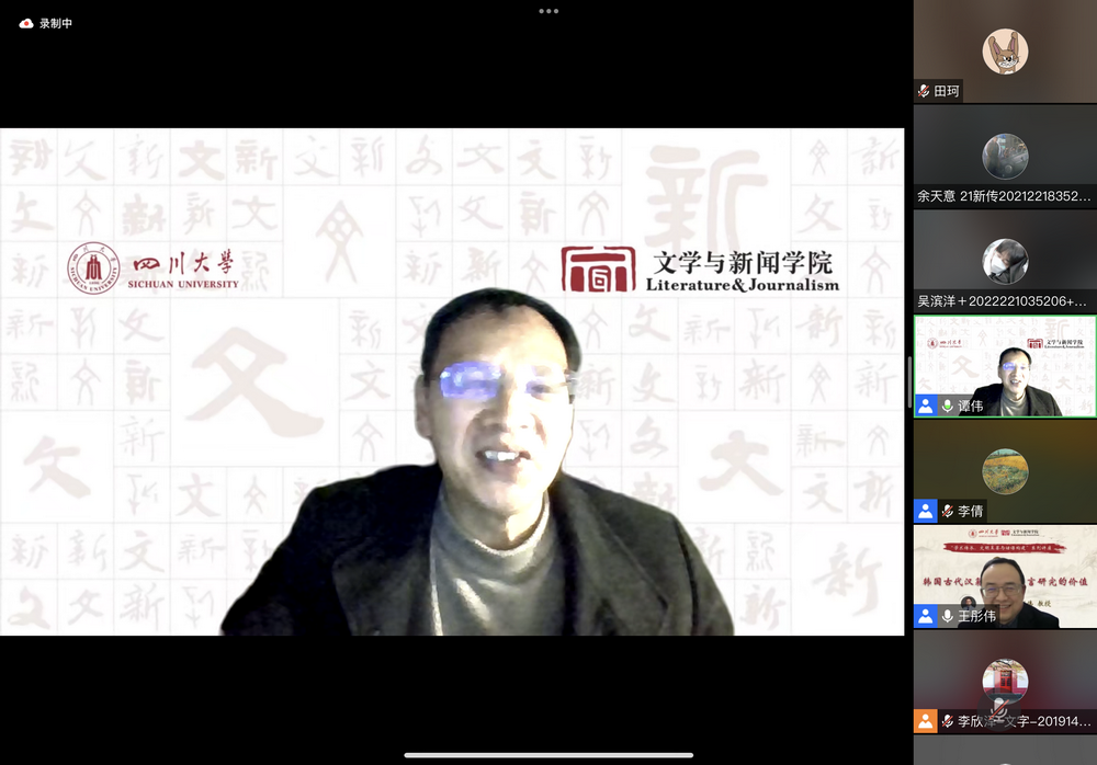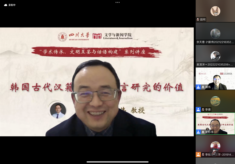2023年2月24日,公司主办的“学术传承、文明互鉴与话语构建”系列讲座第二讲在线上顺利举行。太阳成集团tyc234cc教授,中国俗文化研究所教授,博士生导师,太阳成集团tyc234cc人事处副处长兼青年教师与专职科研队伍管理办公室主任,四川省传统文化社科普及基地副主任王彤伟教授作了“韩国古代汉籍文献及语言研究价值”的主题讲座。讲座由公司谭伟教授主持,校内外师生近200人参与。