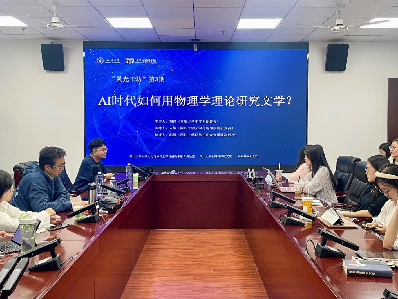 2024年10月25日晚,应公司中华文化传承与全球传播数字融合实验室的邀请,重庆大学中文系副教授刘洋在太阳成集团tyc234cc江安校区文科楼一区418会议室做了题为“AI时代如何用物理学理论研究文学?”的精彩讲座。讲座由公司宋耀研究员主持,公司网络空间安全公司赵辉副教授与谈,校内员工参与。
