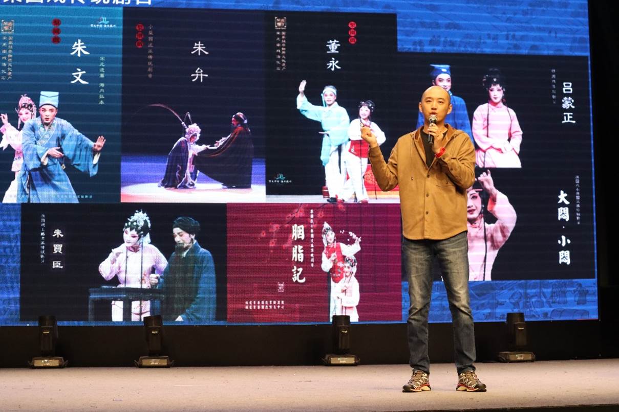 曾静萍老师与曾龙老师首先以对谈和讲故事方式,从剧目、曲牌、表演角色行当等层面讲述了泉州文化名片梨园戏的前世今生。讲到梨园戏发源于宋元时期的泉州,距今已有800年历史,2006年获批列入第一批国家级非物质文化遗产名录;广泛流播于福建泉州、漳州、厦门,广东潮汕及港澳台地区,还有东南亚各国闽南语系华侨居住地。梨园戏保存了宋元南戏的诸多剧作、唱腔和演出规制。在讲到梨园戏行当时,曾静萍老师还现场做了动作示范,强调梨园戏具备一整套程式—— “十八步科母 ”,角色行当有生、旦、净、末、丑、外、贴七个,有大梨园“上路”、“下南”和小梨园“七子班”三个流派,百余出传统剧目和传统曲牌曲谱遗存。