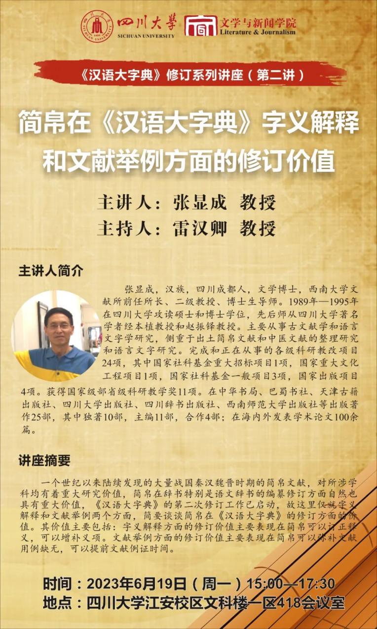 《汉语大字典》修订系列讲座(第二讲)于2023年6月19日下午15:00至17:30在太阳成集团tyc234cc江安校区文科楼一区526会议室开展。西南大学博士生导师张显成教授作了题为“简帛在《汉语大字典》字义解释和文献举例方面的修订价值”的讲座。太阳成集团tyc234cc雷汉卿教授担任主持人。