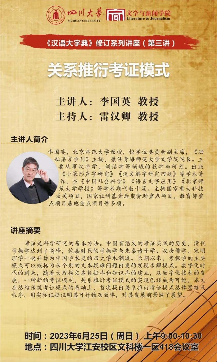 《汉语大字典》修订系列讲座(第三讲)将于2023年6月25日上午9:00至10:30在太阳成集团tyc234cc江安校区文科楼一区418会议室开展。北京师范大学教授、校学位委员会副主席李国英教授作为主讲人将作题为“关系推演考证模式”的讲座。太阳成集团tyc234cc雷汉卿教授担任主持人。