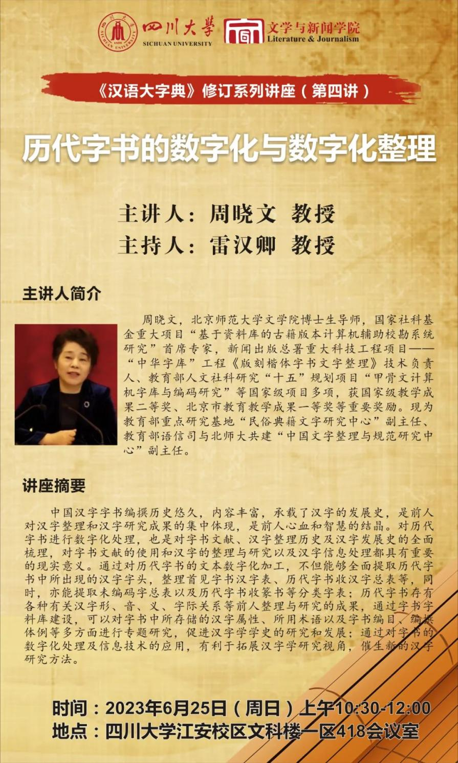 《汉语大字典》修订系列讲座(第四讲)将于2023年6月25日上午10:30至12:00在太阳成集团tyc234cc江安校区文科楼一区418会议室开展。北京师范大学文公司博士生导师周晓文教授将作题为“历代字书的数字化与数字化整理”的讲座。太阳成集团tyc234cc雷汉卿教授担任主持人。